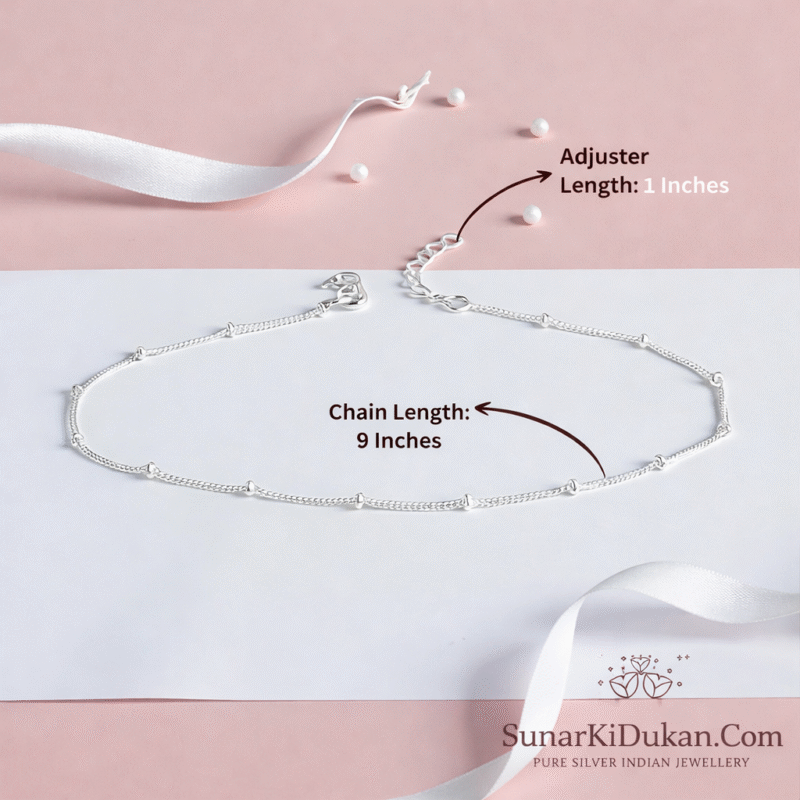 Pure in form and timeless in appeal, the Classic Minimal Silver Anklet with Bead Detailing is crafted from 92.5% pure silver and finished with a luminous rhodium plating for enduring brilliance. The delicate bead accents create a soft rhythm along the chain, adding depth without disturbing its clean, minimal aesthetic.